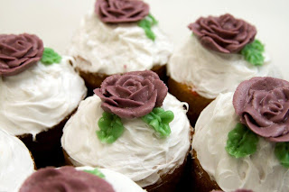 I started making roses for the hell of it this past spring, and the cake decorating just took off. These cupcakes (and mini cupcakes!) were a result of a frosted flower-making binge. The pink ones were almond-flavored, the purple ones were raspberry flavored and the white frosting was coconut.